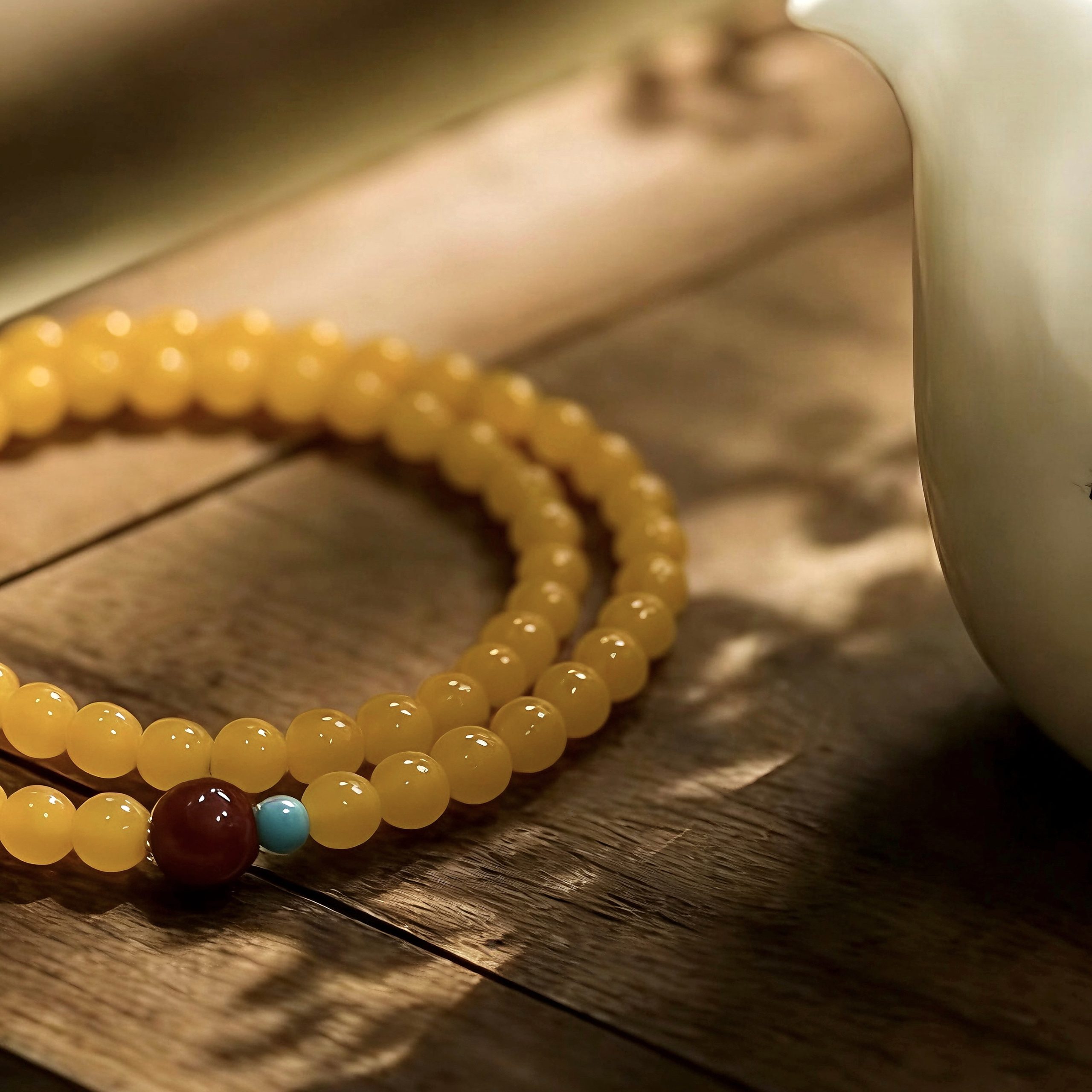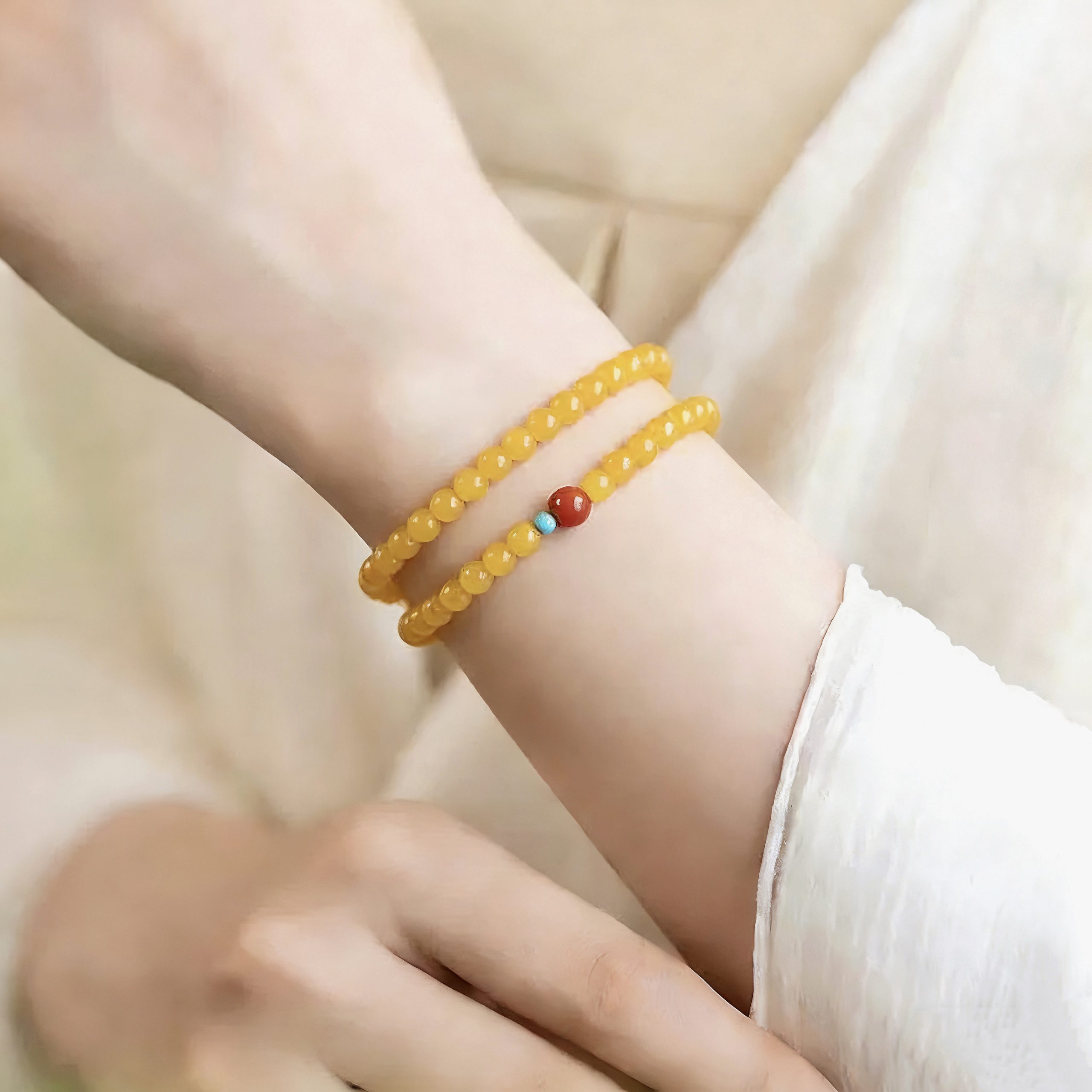 Crafted from natural topaz agate, southern red agate and turquoise, this [Shanyue] New Chinese-style bracelet carries profound cultural meanings. In traditional Chinese culture, topaz—hued in imperial gold—signifies nobility and wealth, bringing vitality and joy. Southern red agate, a unique red agate variety native to China, embodies good fortune, happiness and safety. Turquoise, once a cherished treasure of ancient royal families, stands for protection and strength.