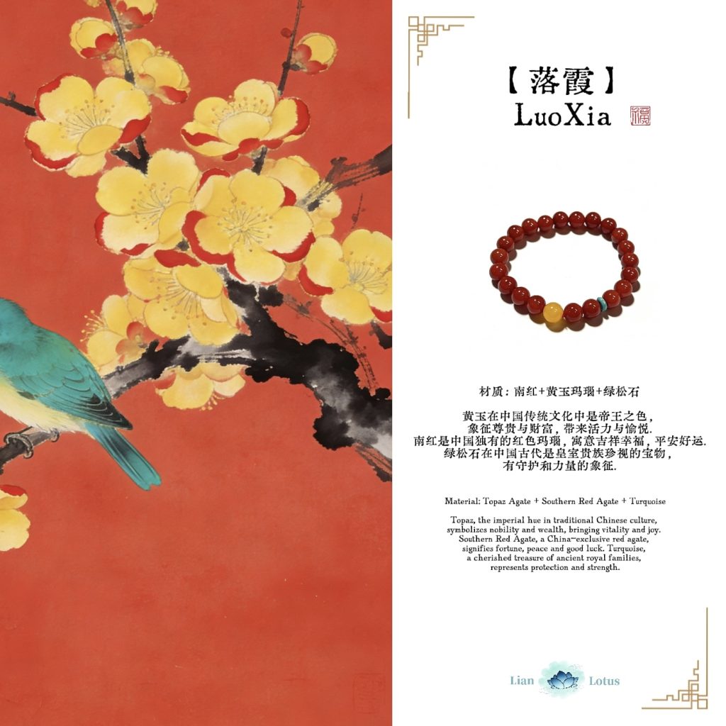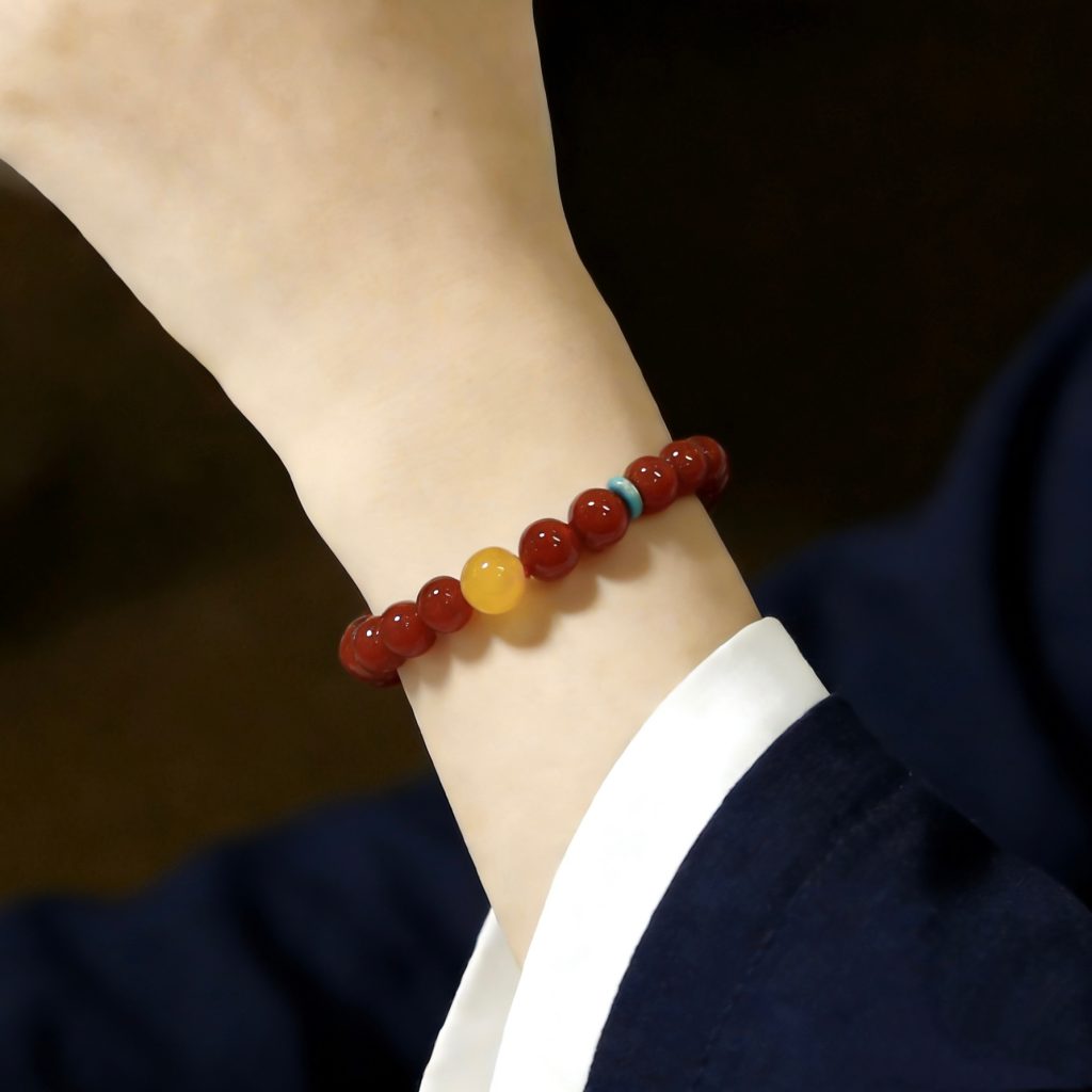 Crafted from 100% natural southern red agate, topaz agate, and turquoise, this [Luoxia] bracelet is steeped in profound cultural symbolism.Topaz Agate: Revered as the “imperial hue” intraditional Chinese culture, it symbolizes nobility and prosperity, infusing the wearer with vitality and joy.Southern Red Agate: A rare red agate exclusive to China, it is a timeless emblem of good fortune, happiness, and peace.Turquoise: A cherished treasure of ancient Chinese royals and nobles, it represents protection and inner strength.