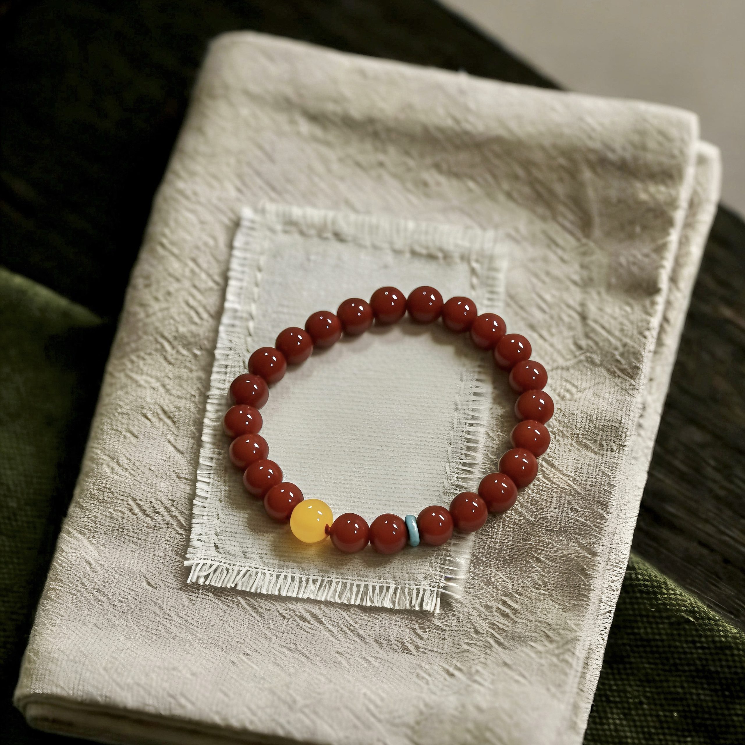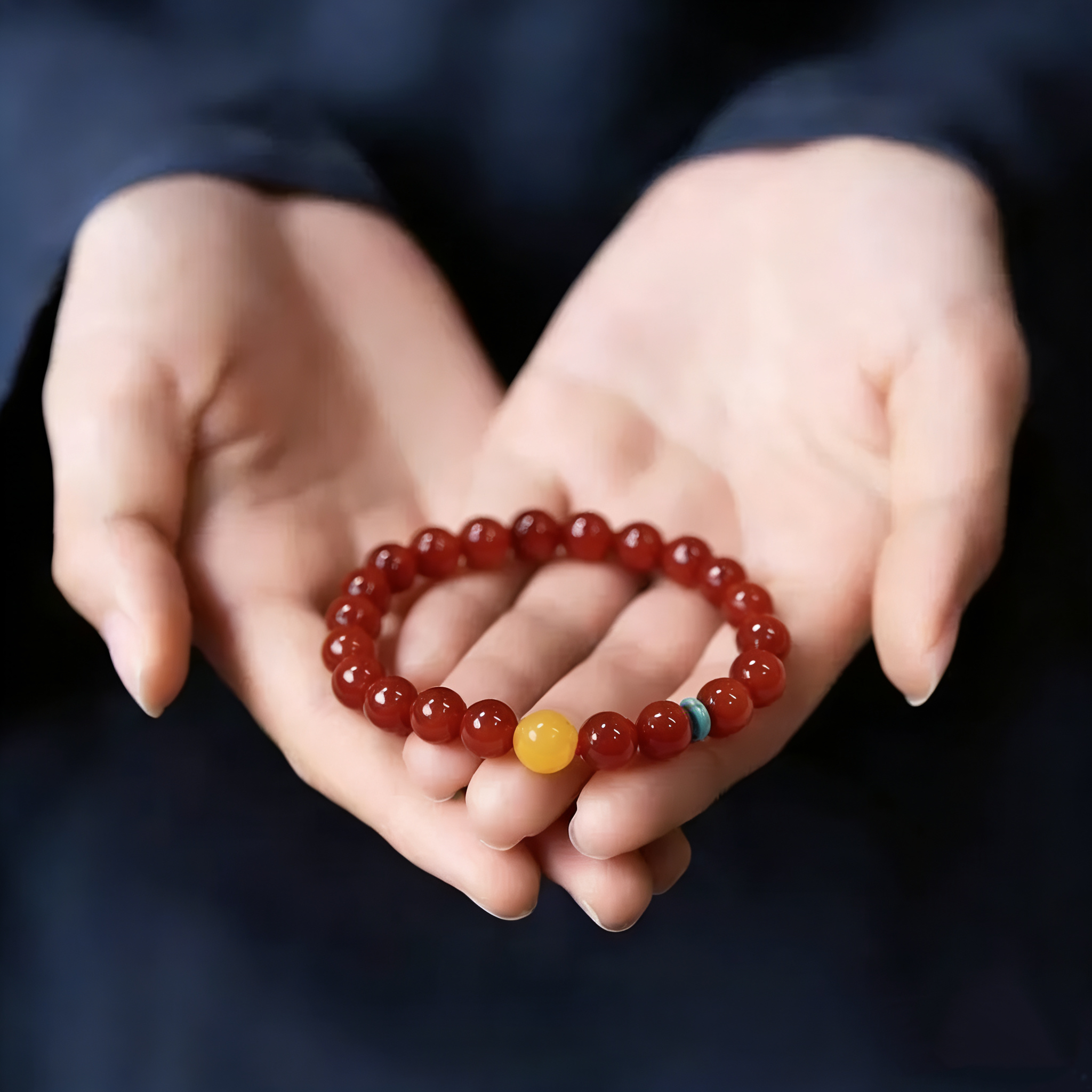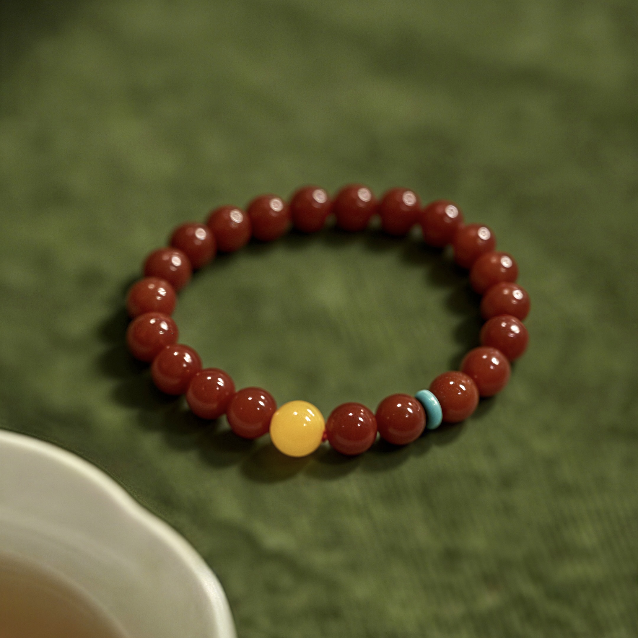 Crafted from 100% natural southern red agate, topaz agate, and turquoise, this [Luoxia] bracelet is steeped in profound cultural symbolism.Topaz Agate: Revered as the “imperial hue” intraditional Chinese culture, it symbolizes nobility and prosperity, infusing the wearer with vitality and joy.Southern Red Agate: A rare red agate exclusive to China, it is a timeless emblem of good fortune, happiness, and peace.Turquoise: A cherished treasure of ancient Chinese royals and nobles, it represents protection and inner strength.