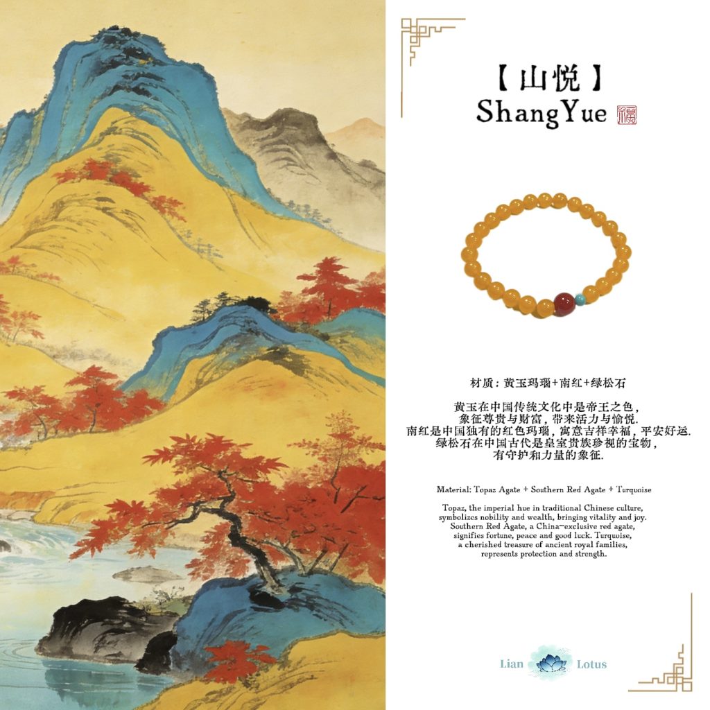 Crafted from natural topaz agate, southern red agate and turquoise, this [Shanyue] New Chinese-style bracelet carries profound cultural meanings. In traditional Chinese culture, topaz—hued in imperial gold—signifies nobility and wealth, bringing vitality and joy. Southern red agate, a unique red agate variety native to China, embodies good fortune, happiness and safety. Turquoise, once a cherished treasure of ancient royal families, stands for protection and strength.