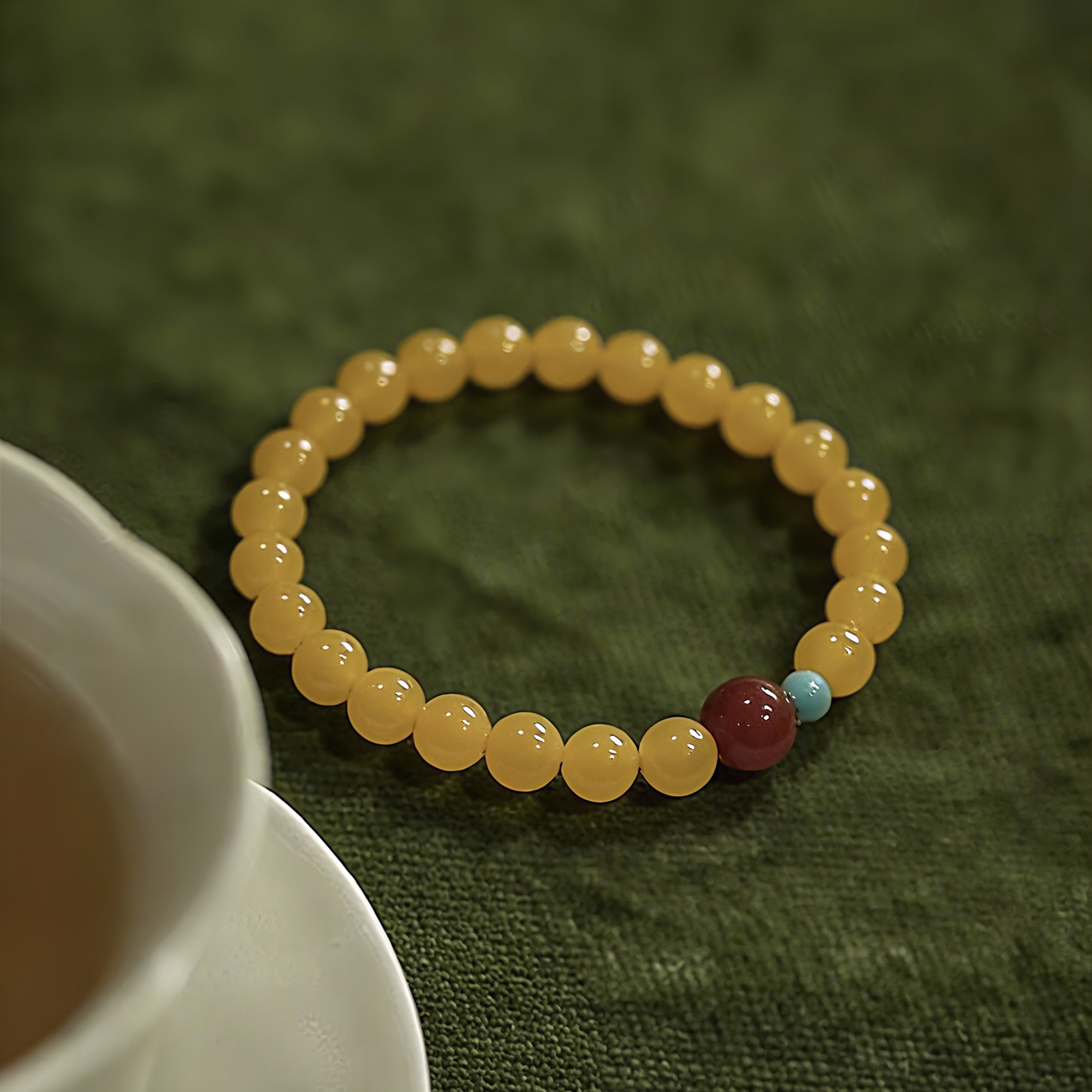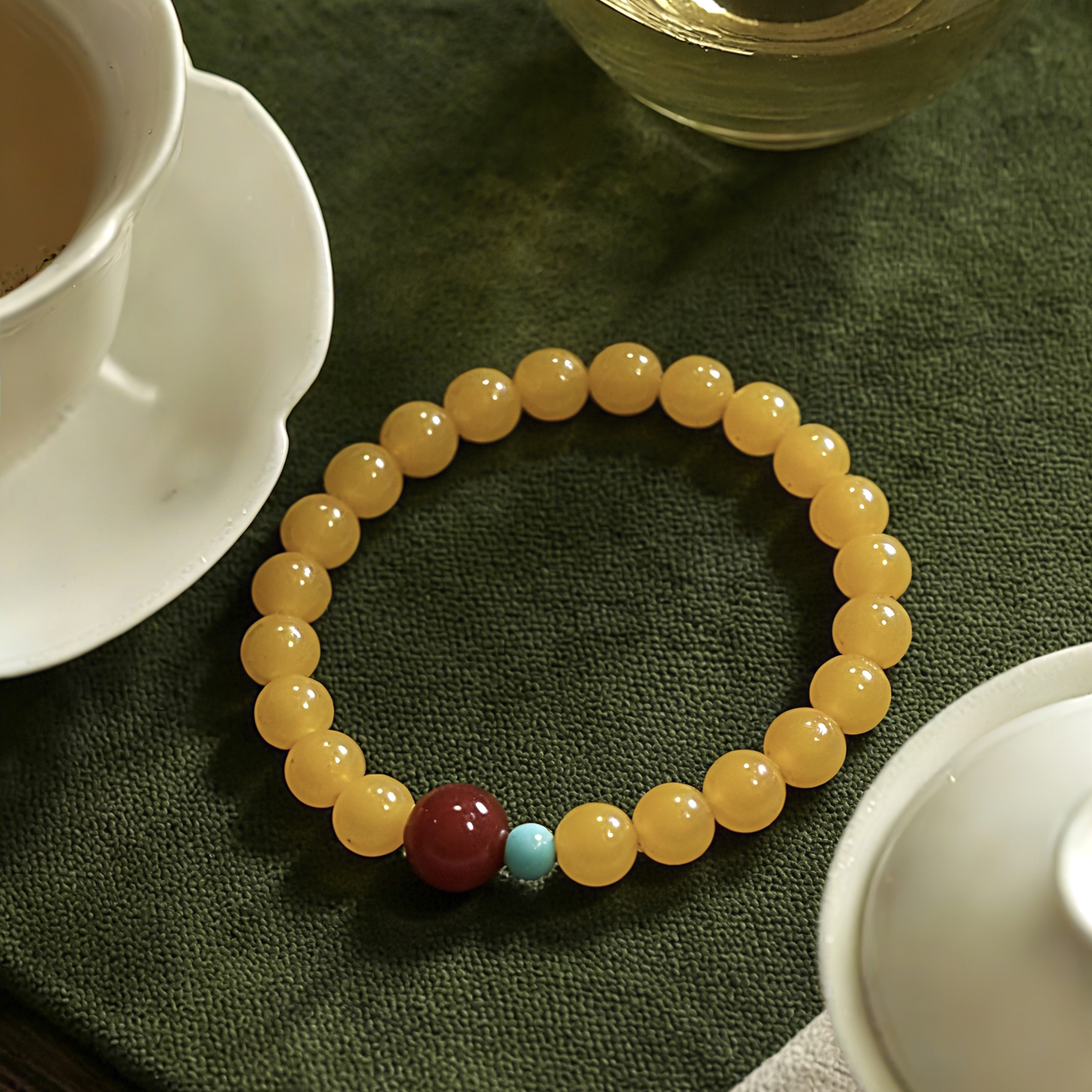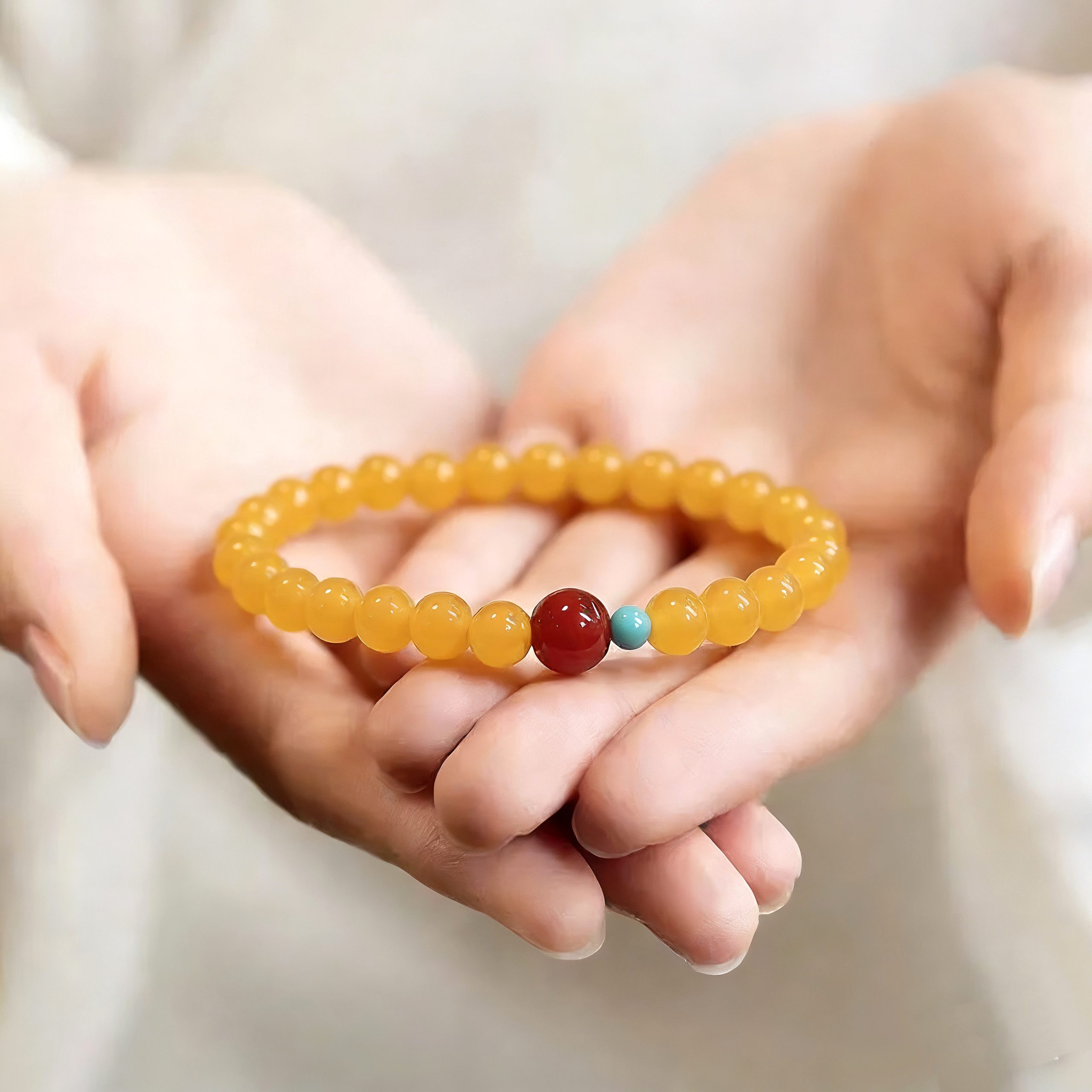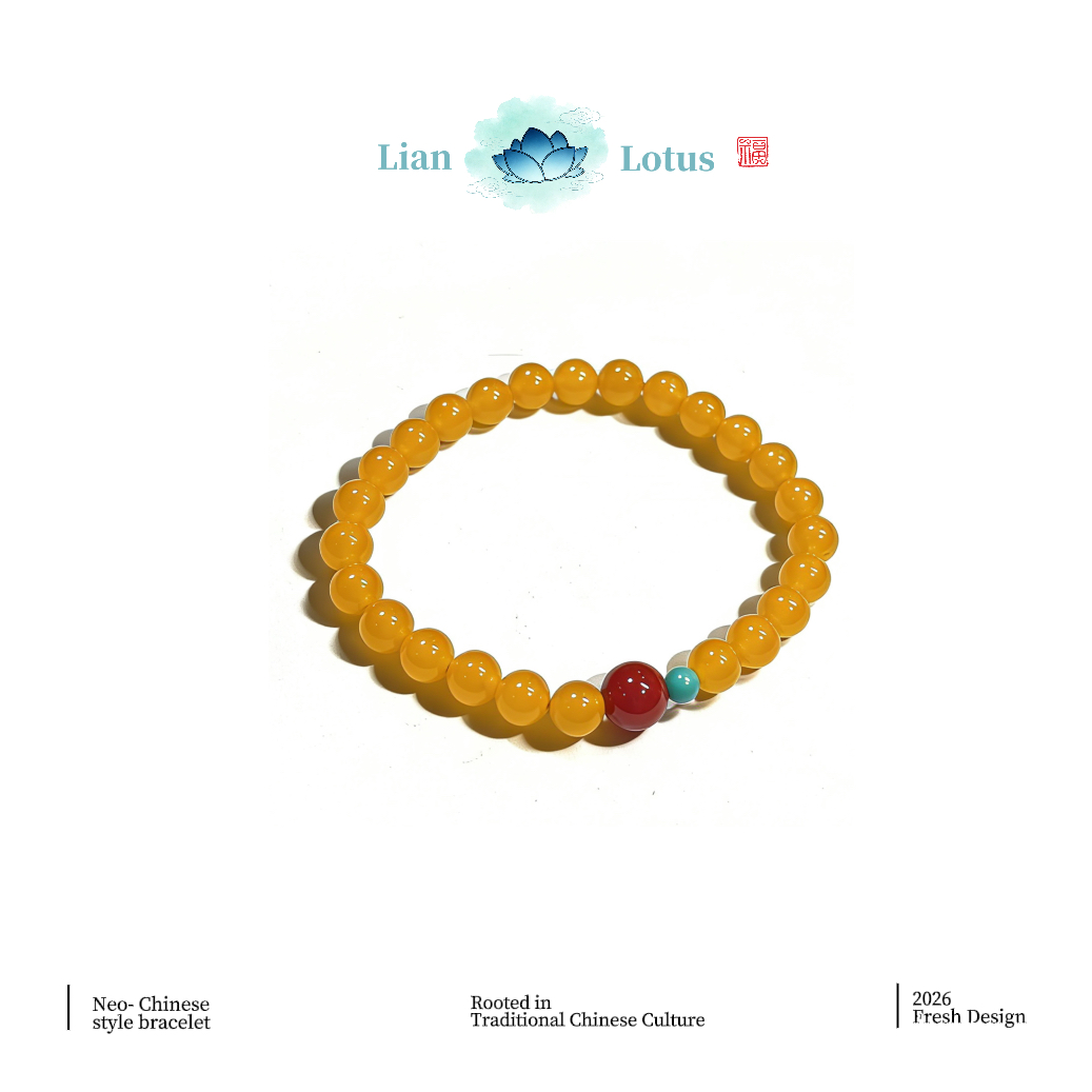 Crafted from natural topaz agate, southern red agate and turquoise, this [Shanyue] New Chinese-style bracelet carries profound cultural meanings. In traditional Chinese culture, topaz—hued in imperial gold—signifies nobility and wealth, bringing vitality and joy. Southern red agate, a unique red agate variety native to China, embodies good fortune, happiness and safety. Turquoise, once a cherished treasure of ancient royal families, stands for protection and strength.