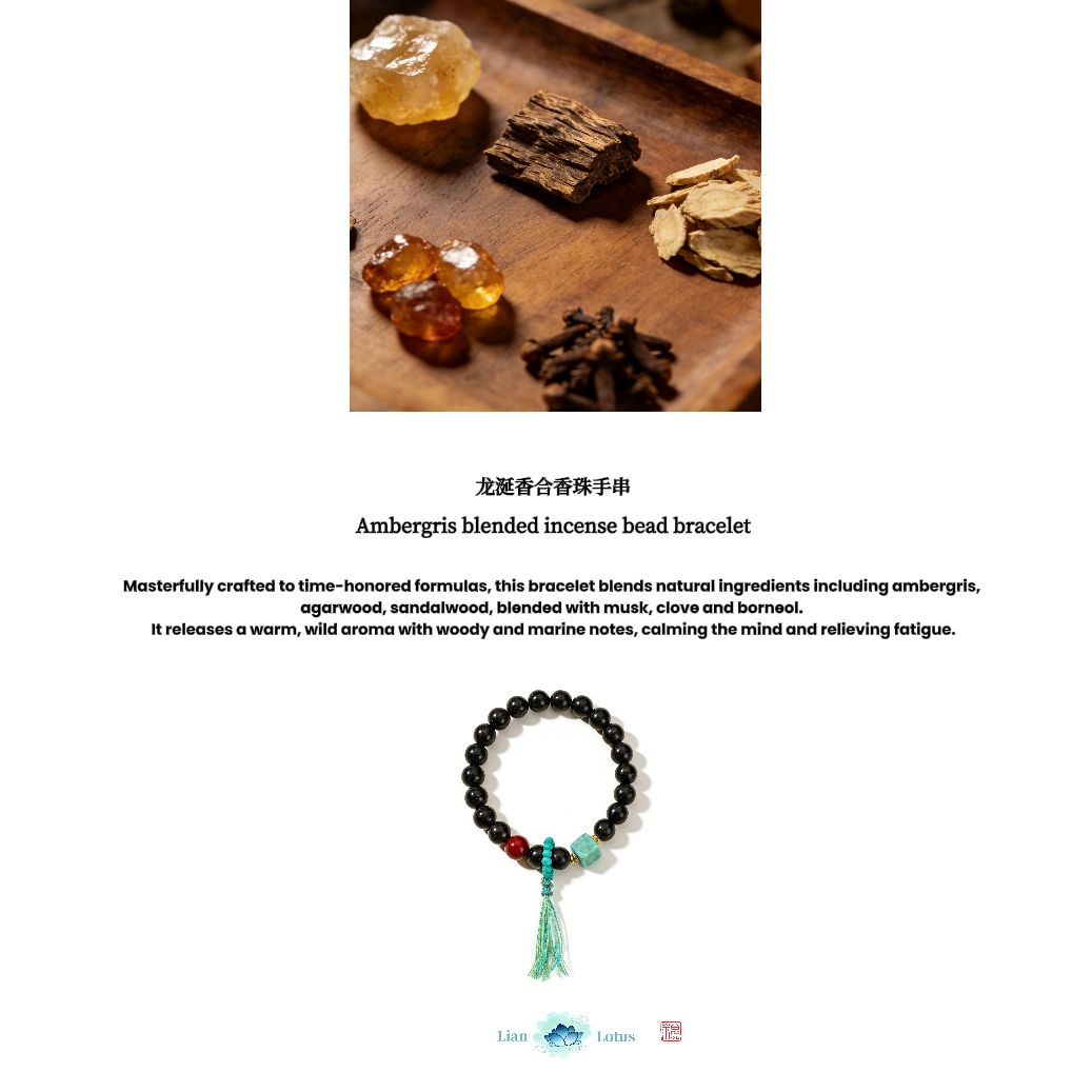 Ambergris Herbal Fragrant Bead Bracelet:Masterfully crafted to time-honored formulas, this bracelet blends natural ingredients including ambergris, agarwood, sandalwood, blended with musk, clove . It releases a warm, wild aroma with woody and marine notes, calming the mind and relieving fatigue.