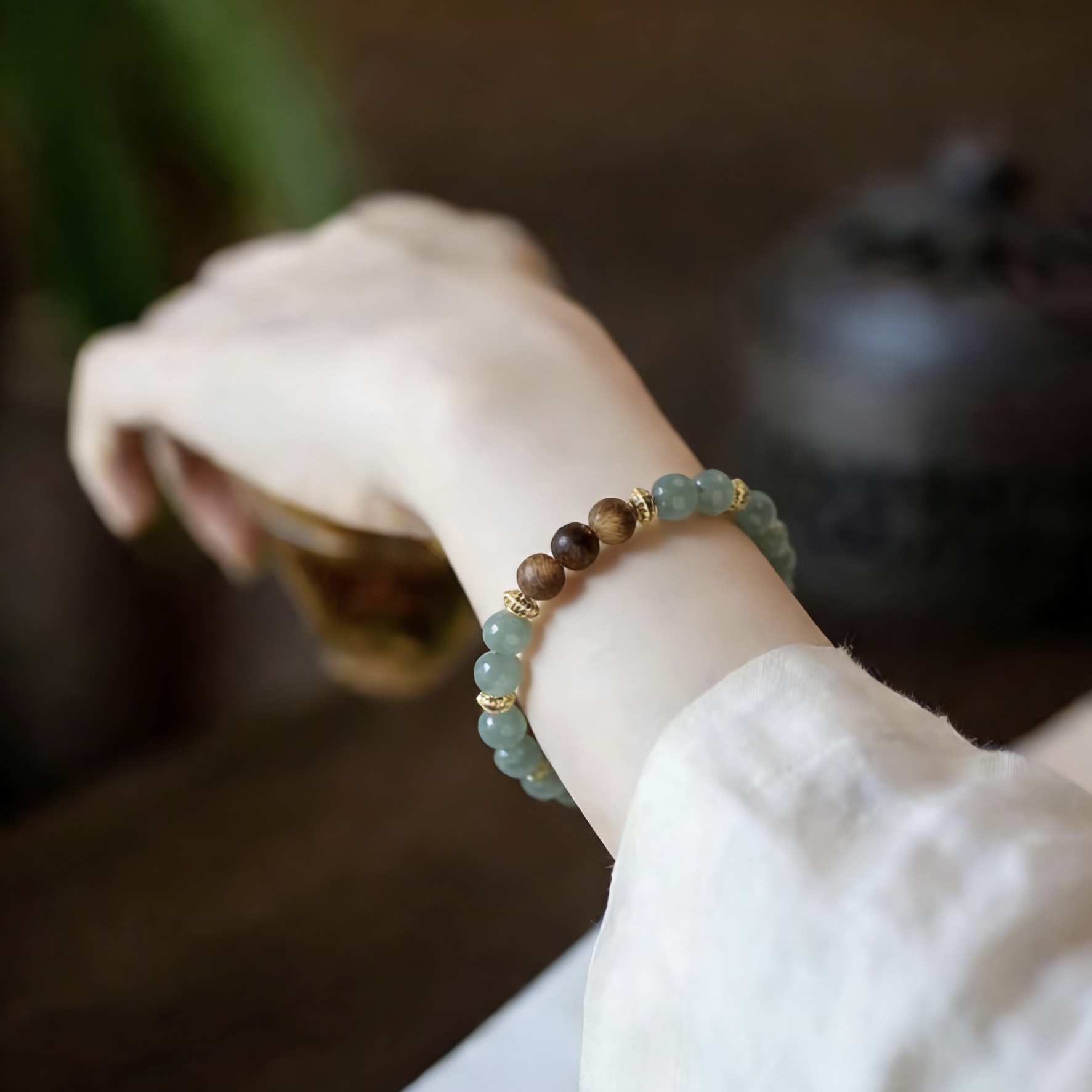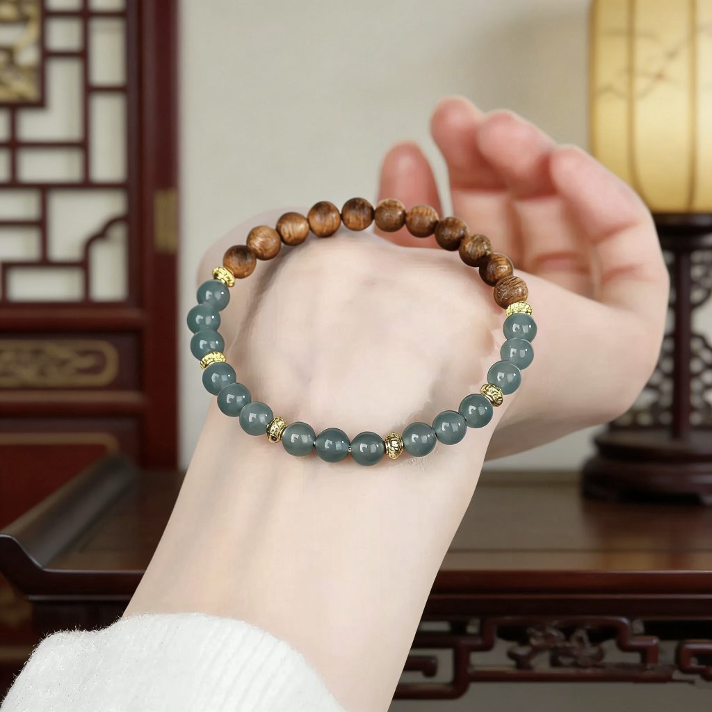 Blue Water Jadeite & Agarwood Bracelet: Yin-Yang Balance & Natural Energy Conduction. Blue Water Jadeite’s yin energy calms mind and relieves tension; Agarwood’s yang energy boosts vitality and wards off negativity. Their complementary energy conducts through wearing, balancing your inner state, easing stress, enhancing vitality and bringing you lasting peace and positive energy daily.