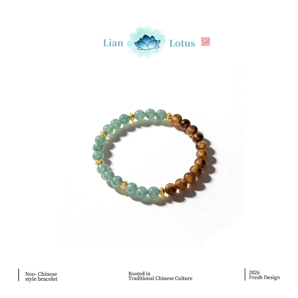 Crafted from natural blue water jade and agarwood, this [Qintan] bracelet holds rich cultural meanings. In Chinese mythology, blue water jade is believed to be the teardrops of the Dragon Maid, embodying protective power, and its blue-cyan hue symbolizes water-like vitality. Agarwood has been revered as an auspicious treasure since ancient China, representing peace. Regarded as a sacred object in Buddhism, it helps purify the mind. Also known as the “Spiritual Wood”, agarwood boasts a captivating fragrance profile: top notes of herbal floral, middle notes of sweet and cool richness, and base notes of charming creamy aroma.